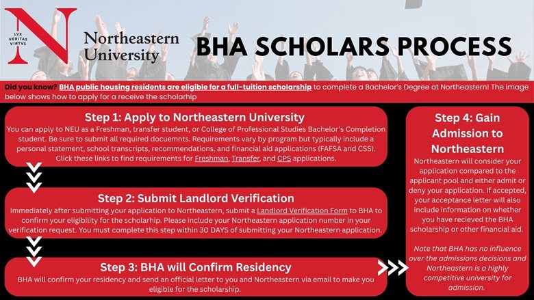 Verification of BHA Public Housing residency does not guarantee you will receive the scholarship. You must also meet Northeastern's admission criteria. BHA does not decide who will receive the scholarship.