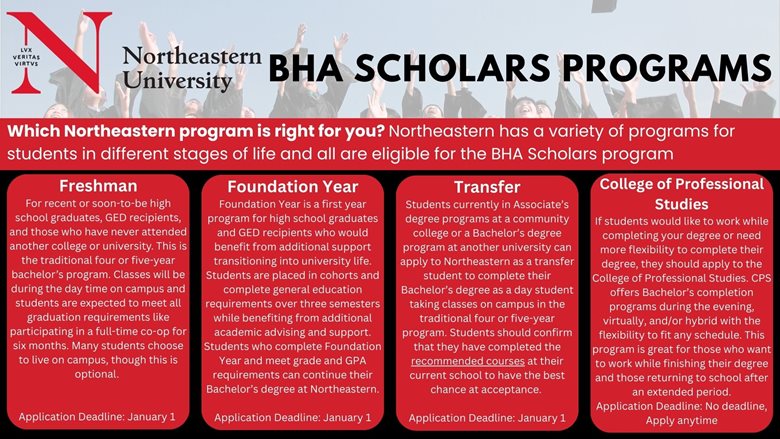 The BHA is excited to partner with Boston's own Northeastern University to offer a full-tuition scholarship for BHA Public Housing residents (including Mixed Finance Sites). Please note: Leased Housing/Voucher Holder residents are not eligible for the scholarship.